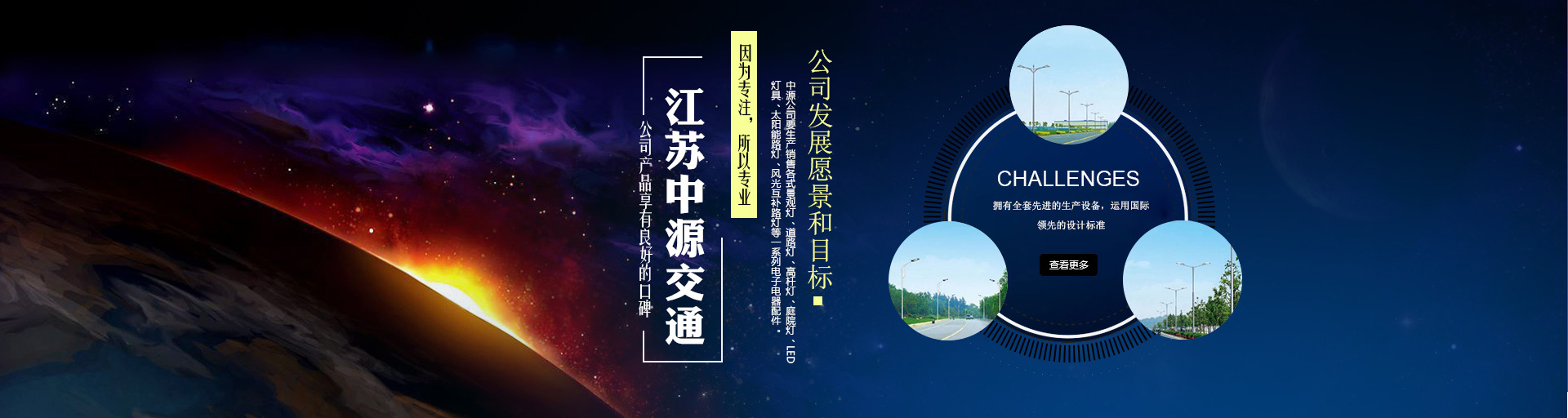 江苏中源交通集团有限公司座落于历史文化名城扬州北郊送桥灯具工业园。是一家专业从事室外照明灯具开发、研制、生产的大型企业。本公司占地面积17000平方米,建筑面积8000平方米,固定资产2009万元。现有职工百余人,工程技术人员贰拾余人,营销人员肆拾余人。拥有完善的生产设备、先进的检测系统、强大的技术力量。中源公司要生产销售各式景观灯、道路灯、高杆灯、庭院灯、LED灯具、太阳能路灯、风光互补路灯等一系列电子电器配件。产品遍销全国,深受广大用户信赖和欢迎。长期以来,公司科技投入,不断开发节能、环保的绿色照明电器产品,每年有十几个新产品投放市场,灵活的销售机制使企业得到长足的发展。企业依靠全国广大客户的支持,连续六年被市工商行政管理局评为重合同,守信用...